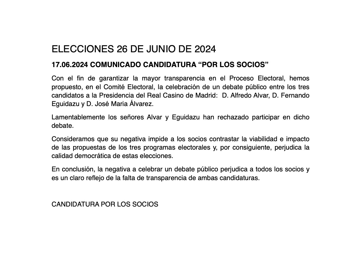Noticias NOTICIAS 05/02/2025 ADMITIDA LA DEMANDA DE IMPUGNACIÓN DE LAS ELECCIONES DEL 26 DE JUNIO DE 2024 26/06/2024 COMUNICADO URGENTE CANDIDATURA POR LOS SOCIOS NOTICIAS 26/06/2024 EL PRESIDENTE DEL RCM DESCONVOCA LAS ELECCIONES DEL 26/06/2024 NOTICIAS 25/06/2024 JOSE Mª ÁLVAREZ EN RADIO LIBERTAD NOTICIAS 24/06/2024 ENTREVISTA EN CAPITAL RADIO NOTICIAS 20/06/2024 FALSEDADES Y POPULISMO EN LAS 'REFLEXIONES 2' NOTICIAS 18/06/2024 COMUNICADO CONTRA LAS 'REFLEXIONES' QUE FALTAN A LA VERDAD NOTICIAS 17/06/2024 LAS CANDIDATURAS DE LOS SRS. ALVAR Y EGUIDAZU SE NIEGAN A MANTENER UN DEBATE ELECTORAL NOTICIAS 14/06/2024 ENTREVISTA A D. JOSÉ Mª ÁLVAREZ NOTICIAS 11/06/2024 CARTA A LOS SOCIOS Copyright © Candidatura Por los Socios 2024 - Aviso legal